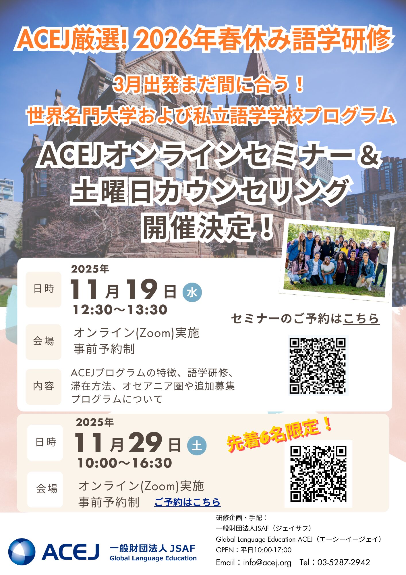 11/19(水)にオンライン(Zoom)にて、オセアニア地域や追加募集プログラムにフォーカスしたACEJセミナーを開催します。