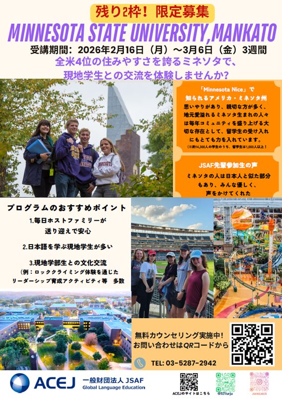 ACEJではこのたび、アメリカ、ミネソタ州立大学マンケート校(Minnesota State University, Mankato)で学ぶ春休み語学研修プログラムの募集を新たにスタートしました。