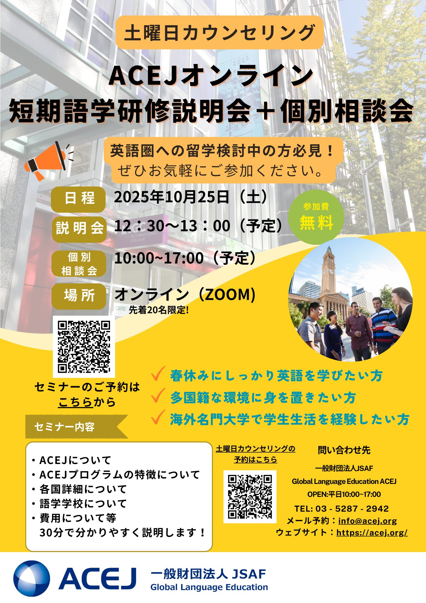 ACEJではこの度、10月25日(土)にオンラインセミナーと個別相談会の開催が決定いたしました!