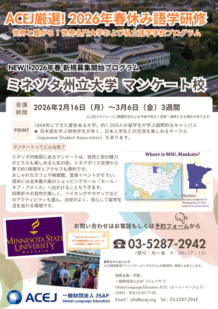 ACEJではこのたび、アメリカ・ミネソタ州立大学マンケート校で学ぶ春休み語学研修プログラムの募集を新たにスタートしました。
