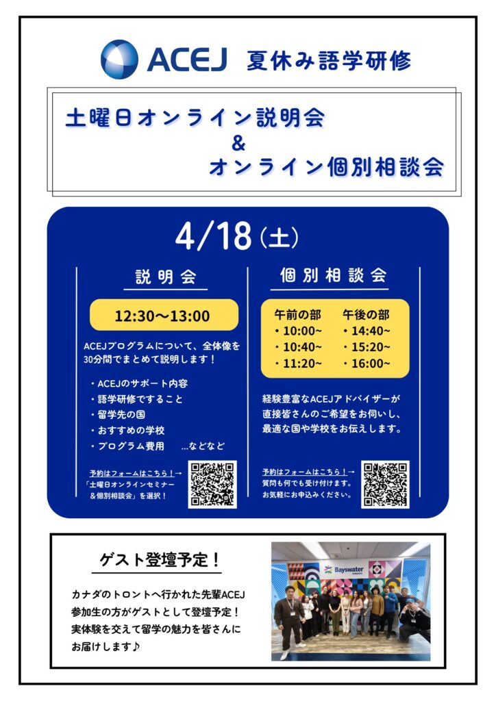 こちらの募集開始に伴い、4月18日(土)にACEJオンライン説明会とオンライン個別相談会の開催が決定しました!
