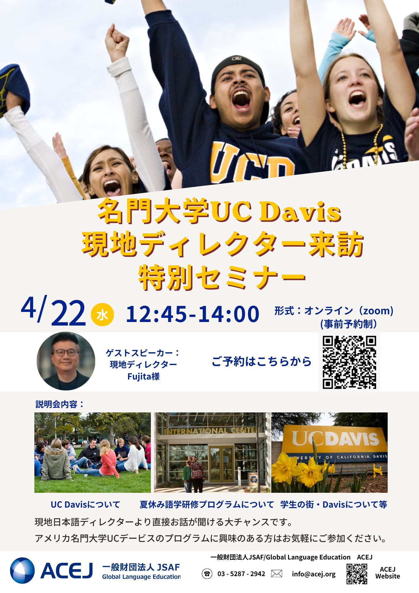 この度、ACEJでは4月22日(水)にアメリカ名門大学 UC Davisの日本語ディレクターによる特別セミナーの開催が決定しました!現地日本語ディレクターから、直接お話が聞ける貴重な機会となります!