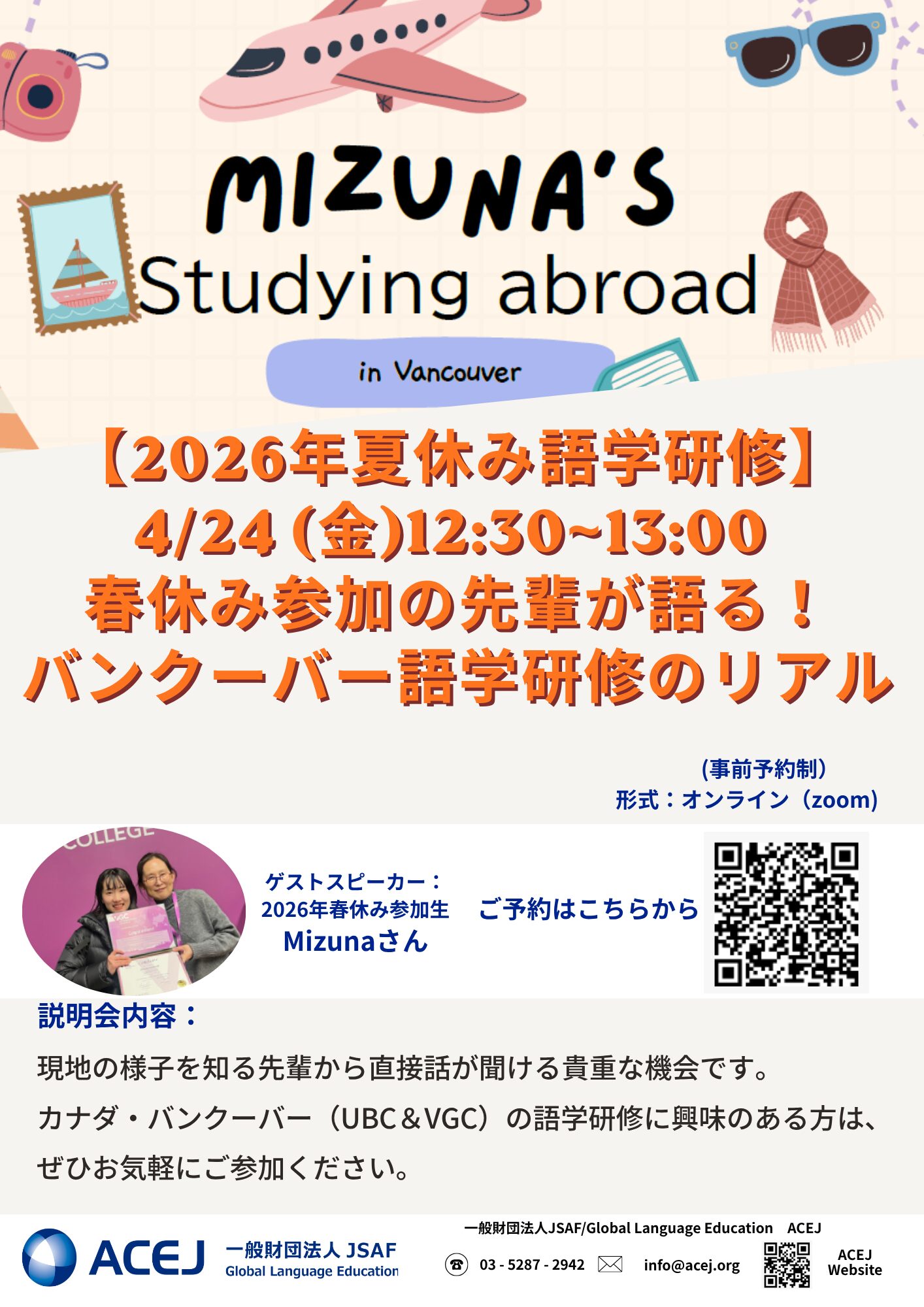 この度、ACEJでは4月24日(金)にカナダ バンクーバーへ渡航された2026年春休み参加生登壇 特別セミナーの開催が決定しました。